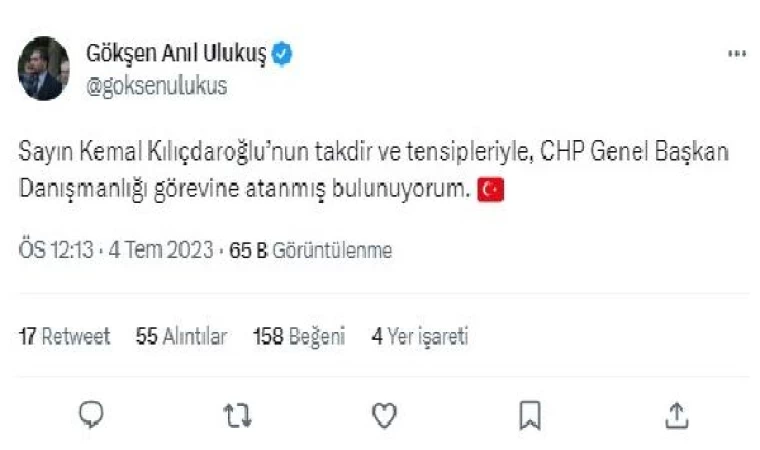 Gökşen Anıl Ulukuş, ZAFER Partisi'nin gençlik yapılanması Ayyıldız Hareketi'nin eski kurucu Genel Başkanı olarak bilinirken, yeni bir gelişme olarak CHP Genel Başkanı Kemal Kılıçdaroğlu'nun danışmanı olarak atanmıştır. Bu değişikliği kendi Twitter hesabından duyuran Ulukuş, "Sayın Kemal Kılıçdaroğlu'nun takdir ve onayıyla CHP Genel Başkan Danışmanlığı görevine atanmış bulunuyorum" ifadelerini kullanmıştır.
