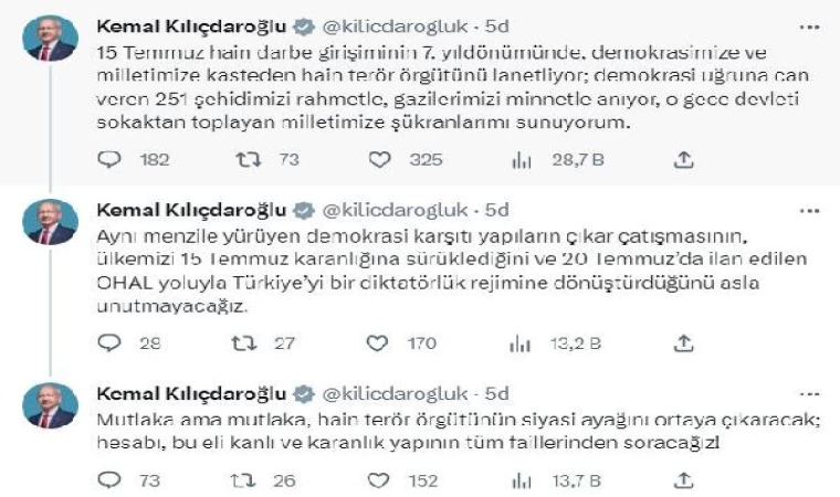 CHP Genel Başkanı Kemal Kılıçdaroğlu, 15 Temmuz darbe girişiminin yıl dönümü nedeniyle Twitter'daki hesabından mesaj yayımladı. Kılıçdaroğlu, "15 Temmuz hain darbe girişiminin 7'nci yıldönümünde, demokrasimize ve milletimize kasteden hain terör örgütünü lanetliyor; demokrasi uğruna can veren 251 şehidimizi rahmetle, gazilerimizi minnetle anıyor, o gece devleti sokaktan toplayan milletimize şükranlarımı sunuyorum. Aynı menzile yürüyen demokrasi karşıtı yapıların çıkar çatışmasının, ülkemizi 15 Temmuz karanlığına sürüklediğini ve 20 Temmuz’da ilan edilen OHAL yoluyla Türkiye’yi bir diktatörlük rejimine dönüştürdüğünü asla unutmayacağız. Mutlaka ama mutlaka, hain terör örgütünün siyasi ayağını ortaya çıkaracak; hesabı, bu eli kanlı ve karanlık yapının tüm faillerinden soracağız" dedi. (DHA)
