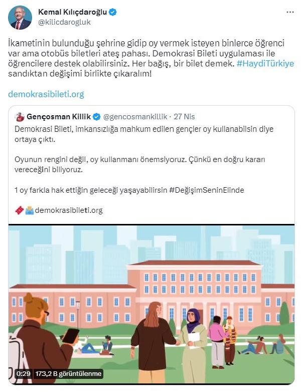 CHP lideri ve cumhurbaşkanı adayı Kılıçdaroğlu, CHP Gençlik Kolları Genel Başkanı Gençosman Killik’in, "'Demokrasi Bileti, imkansızlığa mahkum edilen gençler oy kullanabilsin diye ortaya çıktı. Oyunun rengini değil, oy kullanmanı önemsiyoruz. Çünkü en doğru kararı vereceğini biliyoruz. 1 oy farkla hak ettiğin geleceği yaşayabilirsin" mesajını alıntılayarak yaptığı paylaşımda, "İkametinin bulunduğu şehrine gidip oy vermek isteyen binlerce öğrenci var; ama otobüs biletleri ateş pahası. Demokrasi Bileti uygulaması ile öğrencilere destek olabilirsiniz. Her bağış, bir bilet demek. Haydi Türkiye sandıktan değişimi birlikte çıkaralım" ifadelerini kullandı. (DHA)