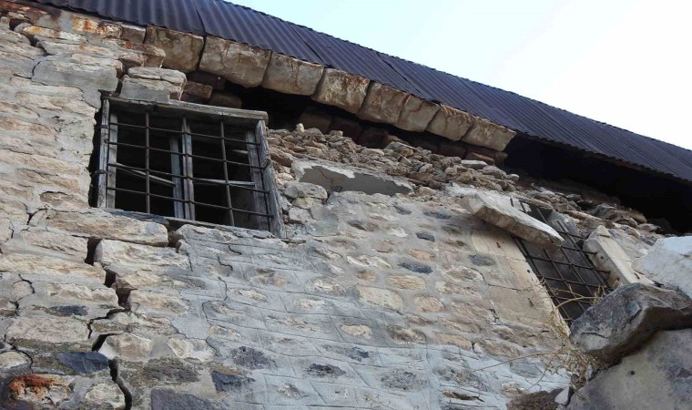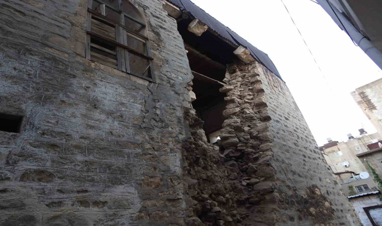 Kilis’te depremde ağır hasar gören tarihi tescilli 2 katlı binanın bir kısmı kendiliğinden yıkıldı.