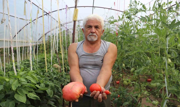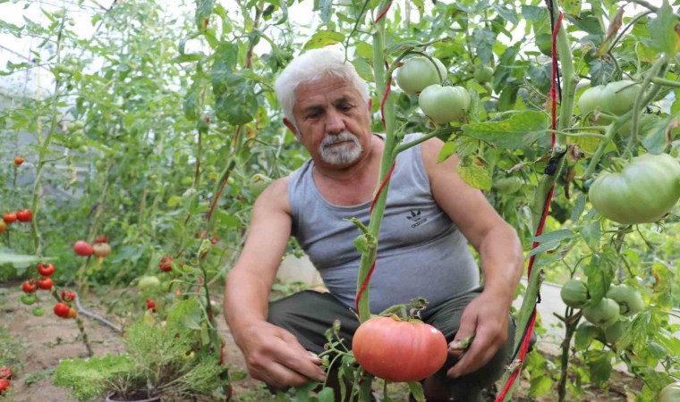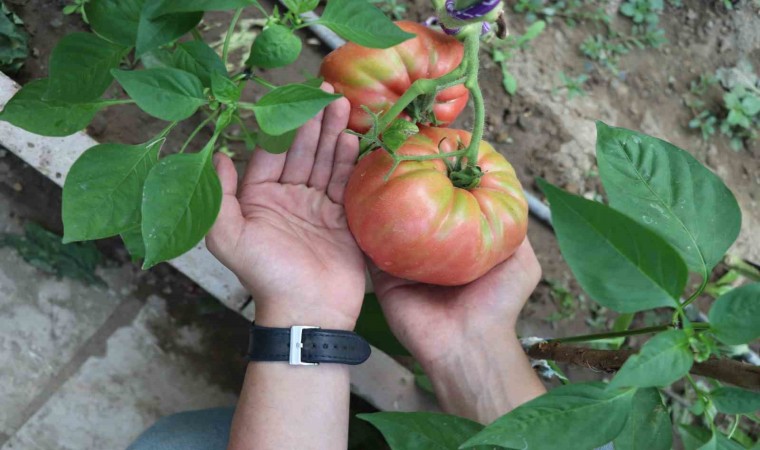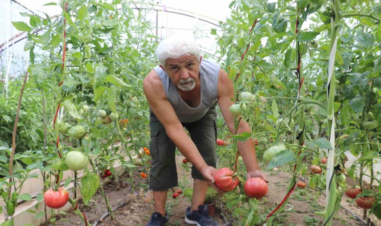 Amerika’dan ilk geldiğinde tohumları kimsenin kullanmadığını anlatan Bülent İçmez, "Emekli olduktan sonra kendime bu serayı düzenledim. 20 yılı aşkın süredir de bu serayla uğraşıyorum. Çocukluktan gelen serayla uğraşma merakım var. Burada yedi çeşit domatesim var. Normal marketlerde satılan sırık domates, Çanakkale domatesi, pembe domates, çerilerin turuncu ve kırmızısı var. 10 çeşide yakın da biberim var. Emekli olduktan sonra vaktimi burada geçiyorum. Akrabalarım buraya geliyor, istedikleri kadar alıp gidiyorlar. İlaç veya fenni gübre vermiyorum. Çiftlik gübresi kullanıyorum, ilacı da mevsimine göre veriyorum. İlacı da ısırgan ve semizotundan elde ediyorum. Dışardaki küvetin içinde 10 gün durduktan sonra sıvı gübre oluyor. Bu pembe domateslerin tohumu 20 yıl önce bana Amerika’dan geldi. Bu kadar büyüyeceğini de tahmin etmemiştim. Amerika’dan geldiği için kimse bilmiyordu bu pembe domateslerin tohumunu. Biraz yumuşak bir yapısı olduğu için de marketlerde satışa uygun görülmedi. Ben de kendi çapımda geliştirdim, geçtiğimiz yıl 1kilo 100 grama kadar büyüttüm. Şu an tarttıklarımızdan 1 kilo 40 gram gelenler var, 900 gram olanlar var. Sabah kahvaltısında menemen için çok uygun, bir tanesi veya iki tanesi bir aileye yetebilecek kadardır. Elimdeki domateslerin bir tanesi 1 kilodan fazla, diğeri de yakın gelmişti. Bir insanın elinden daha büyükler. Bununla marketten aldığınız 4 domates yerine bir tane almanız yetiyor" şeklinde konuştu.