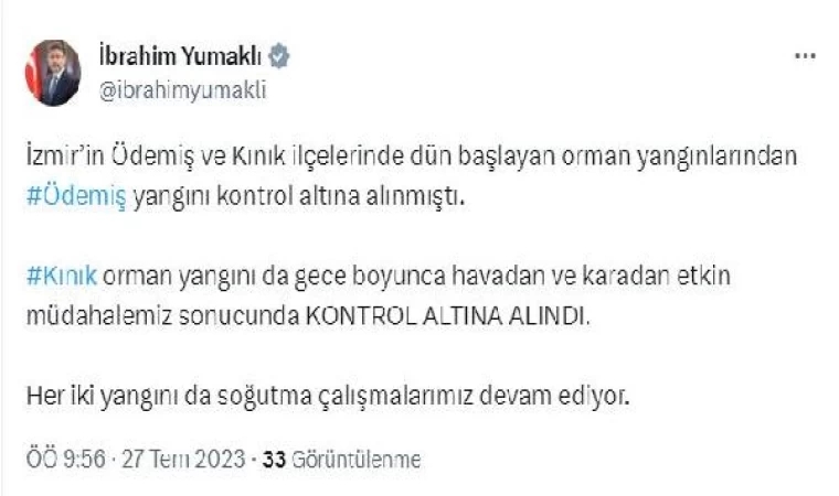 Tarım ve Orman Bakanı İbrahim Yumaklı, sosyal medya hesabından yaptığı açıklamada, "İzmir’in Ödemiş ve Kınık ilçelerinde dün başlayan orman yangınlarından Ödemiş yangını kontrol altına alınmıştı. Kınık orman yangını da gece boyunca havadan ve karadan etkin müdahalemiz sonucunda kontrol altına alındı. Her iki yangını da soğutma çalışmalarımız devam ediyor" dedi. (DHA)