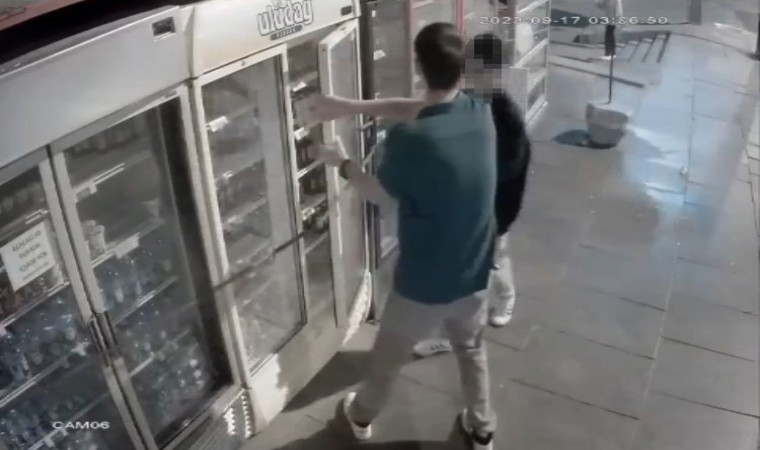 Ankara’da üç kişinin büfe dolabını kırarak içecek çaldığı anlar kameraya yansıdı.