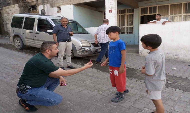 Hatay’ın Kırıkhan ilçesinde polis ekipleri, asayiş uygulaması gerçekleştirdi. Uygulamada polisler, çocuklara bayram şekeri de dağıttı.