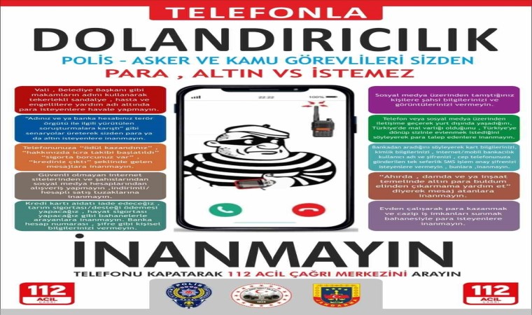 Kırklareli İl Emniyet Müdürlüğü Toplum Destekli Polislik Şube Müdürlüğünce, kentte telefon dolandırıcılığı, sahte para ve hırsızlık konularında karşı alınabilecek önlemler konusunda bilgilendirmek için vatandaşların yoğun olarak bulunduğu kapalı pazar yeri ve bankalar ziyaret edildi. Vatandaşlara suç mağduru olmamaları için kendilerini savcı, polis, asker ve kamu görevlisi gibi tanıtarak arayıp vatandaşlardan para veya evde bulunan değerli eşyaları istemeleri halinde yada “Adınız veya banka hesabınız FETÖ ve PKK terör örgütleriyle ilgili yürütülen soruşturmalara karıştı, hattınız terör örgütü tarafından kullanılmış, hesabınızdan terör örgütü hesabına para aktarılmış, cezaya düşmüş vergi borcunuz var, SGK ve Bağ-Kur prim borçlarınızdan sizi kurtarabiliriz, hediye kazandınız’’ gibi söylemlere, telefonlarına “Ödül Kazandınız, Hakkınızda icra takibi başlatıldı, Sigorta borcunuz var, krediniz çıktı’’ vb. şeklinde gelen mesajlara itibar etmemeleri ve evden çalışarak para kazanmak ve cazip iş imkanları sunmak bahanesiyle ve buna benzer durumlarla para isteyenlere inanmamaları yönünde uyarılarda bulunuldu. Herhangi bir konu hakkında bilgilerine ihtiyaç duyulduğunda mutlak suretle yüz yüze görüşme yapıldığını ve bu görüşmenin Emniyet Birimlerinde olduğunu unutmamaları yönünde afiş asan polisler, broşür dağıtarak bilgilendirme bilinçlendirme çalışması yaptı.