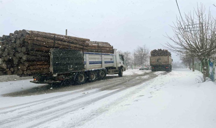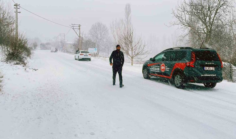 Kırklareli’nin yüksek kesimlerinde etkili olan kar sebebiyle araçlar yolda kaldı.