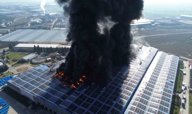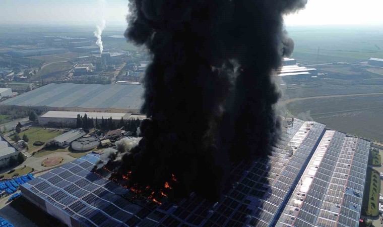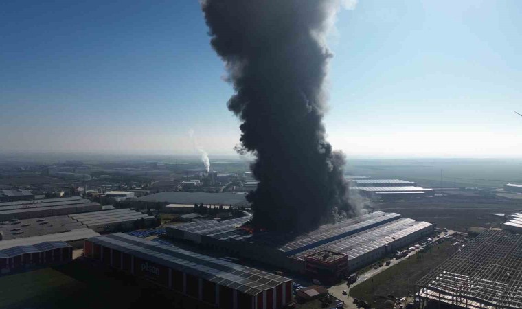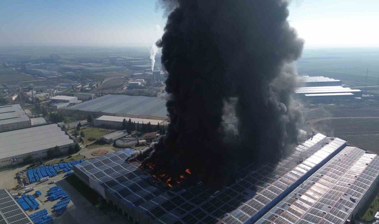 Kırklareli‘nin Lüleburgaz ilçesine bağlı Büyükkarıştıran beldesinde oyuncak fabrikasında çıkan yangın devam ederken, yangının boyutu dronla havadan görüntülendi.
