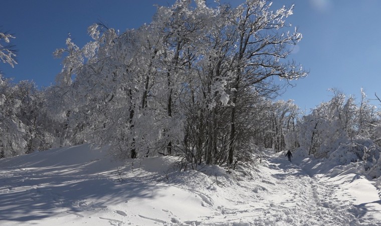 Kırklareli’nin yüksek bölgelerinde etkili olan yoğun kar yağışı, doğayı beyaz bir örtüyle kapladı. Özellikle Bulgaristan’a ulaşımın sağlandığı Dereköy, Demirköy, Kofçaz’ın çevresinde kar kalınlığı yer yer yaklaşık 50, 60 santimetreyi bulurken, karla kaplanan ağaçlar adeta kartpostallık görüntüler oluşturdu. Doğanın eşsiz manzarası, dron ile görüntülendi.