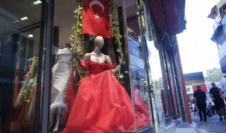 Edirne’de kırmızı beyaz elbiselerle süslenen vitrinleri görenler, dönüp bir daha bakıyor.