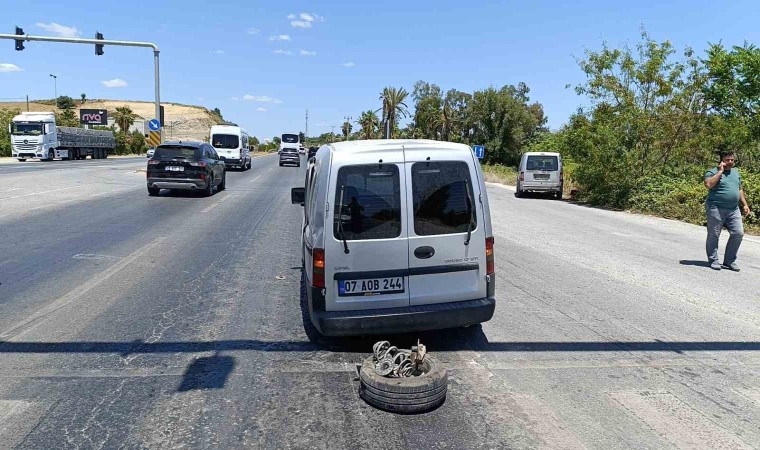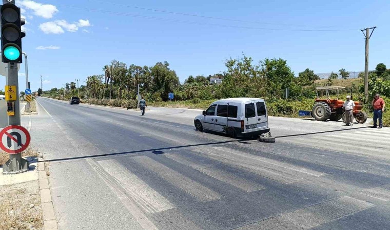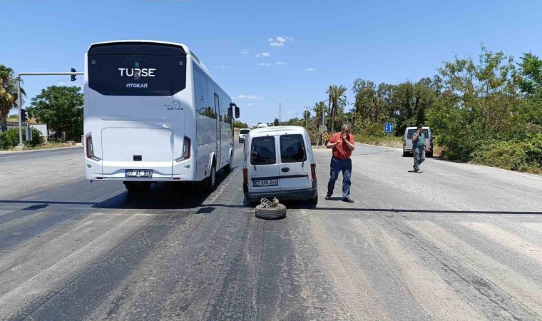 Antalya’da kırmızı ışıkta bekleyen ve içinde 6 kişinin bulunduğu ticare araca arkadan hızla gelen tur minibüsü çarptı. Ticari araç yaklaşık 10 metre sürüklenirken çarpmanın etkisiyle ön tekeri kırılan tur minibüsü yaklaşık 100 metre ileride durabildi. Her iki araçta da kimse yaralanmazken kaza yapan araçlarda bulunanların yardımına o esnada traktörle geçmekte olan köylüler yetişti.
