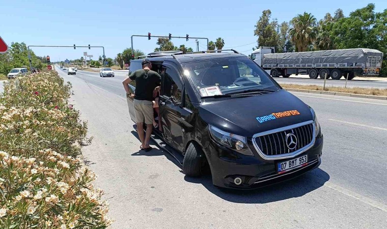 Kaza, Alanya-Manavgat D-400 karayolu üzerinde Tekandız mevkiinde meydana geldi. Kavşak sisteminde kırmızı ışıkta bekleyen Hasan Hüseyin Tellioğlu’nun kullandığı 07 AOB 244 plakalı hafif ticari araca, Alanya istikametinden gelmekte olan Kadir Yıldırım’ın yönetiminde ki 07 BMF 953 plakalı turizm transfer aracı duramayarak arkadan çarptı. Çarpmanın şiddetiyle 10 metre sürüklenen hafif ticari aracın sol arka tekeri koparken, aşırı hızlı olduğu görülen ve içerisinde turistlerin olduğu transfer aracı yaklaşık 100 metre ileride durabildi.