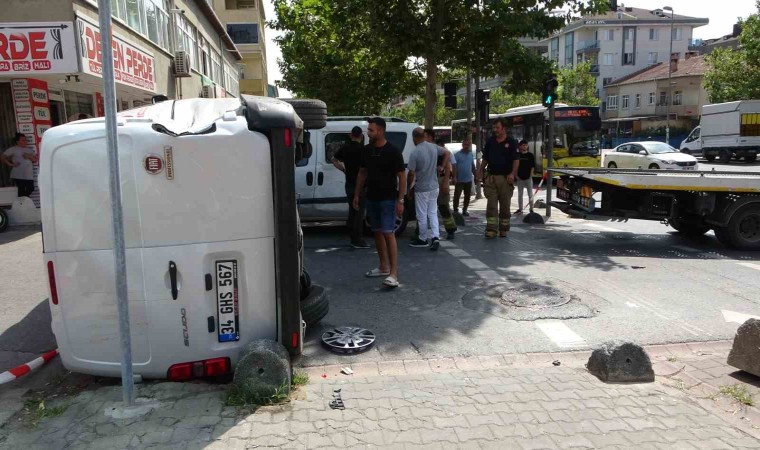 Sancaktepe’de kırmızı ışıkta geçtiği iddia edilen İETT otobüsü, cadde üzerinde karşıdan karşıya geçmekte olan kamyonete çarptı. Kazada devrilen kamyonetin sürücüsü hafif yaralandı. Kaza anı güvenlik kamerasına yansıdı.