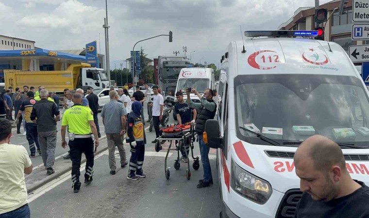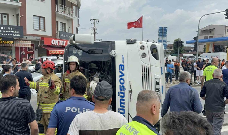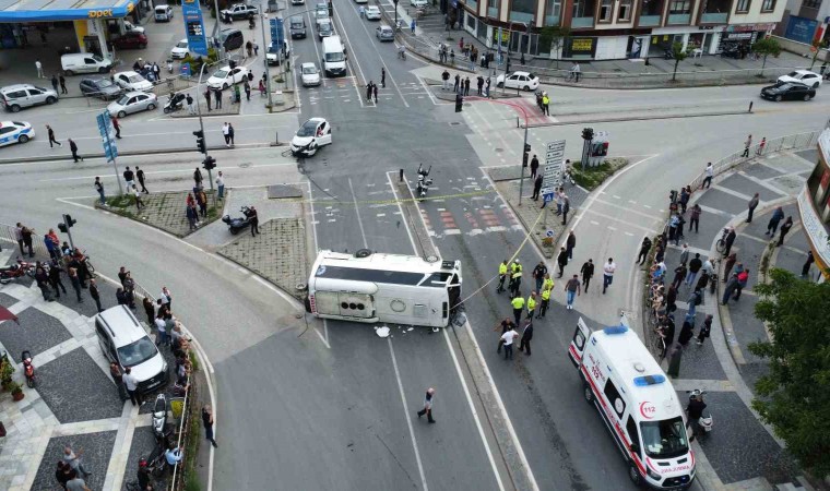Düzce’de kırmızı ışıkta geçen otobüse jip çarpınca devrildi. Kazada 8 kişi yaralanırken, yaralılar otobüsün arka camından çıkarıldı.