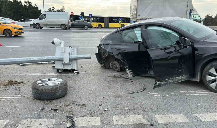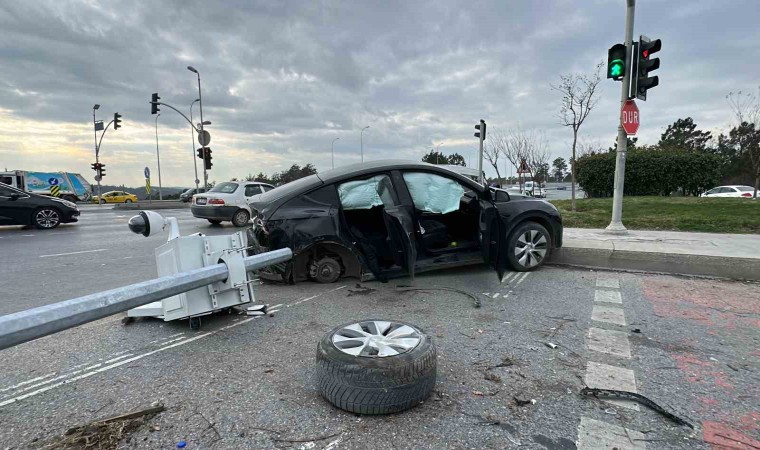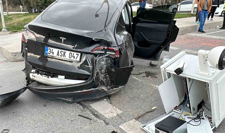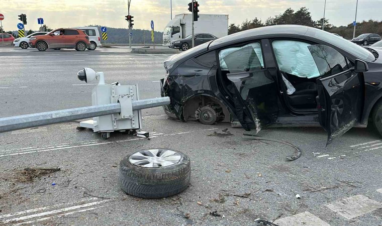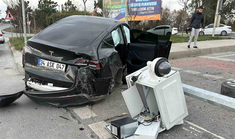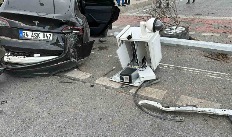 Arnavutköy’de kırmızı ışıkta geçtiği iddia edilen Tesla sürücüsü önce bir ticari araca daha sonra Kent Güvenlik Yönetim Sistemi (KGYS) direğine çarptı. Kaza da araç içinde bulunan 1 çocuk yaralanarak hastaneye kaldırılırken KGYS direği yerinden sökülerek devrildi.