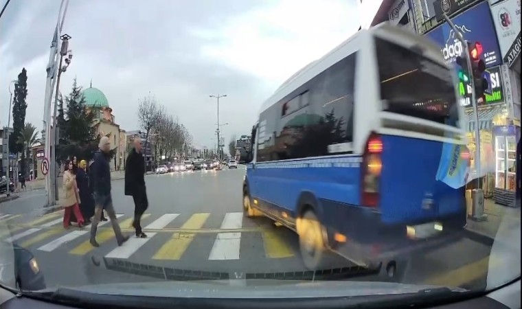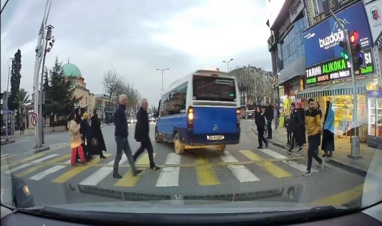 Adapazarı Adnan Menderes Caddesi Yeni Cami ışıklarında ‘M’ plakalı şehir içi toplu taşıma aracı kırmızı ışıkta geçti. Kural tanımaz sürücü, bu esnada yaya geçidi üzerinden yolun karşısına geçmek isteyen vatandaşları da riske attı. Minibüsün, kırmızı ışıkta yaya geçidinden geçerek trafik güvenliğini tehlikeye attığı ve yaya geçidinden geçmek üzere olan bir yayaya çarpmaktan kıl payı kurtulduğu anlar ise farklı bir araç kamerası tarafından saniye saniye kaydedildi. Görüntülerde, minibüsün dolmuşun kırmızı ışıkta geçmesi, yayanın araçtan kaçması ve dolmuşun hatalı şerit değiştirerek gitmesi yer aldı.