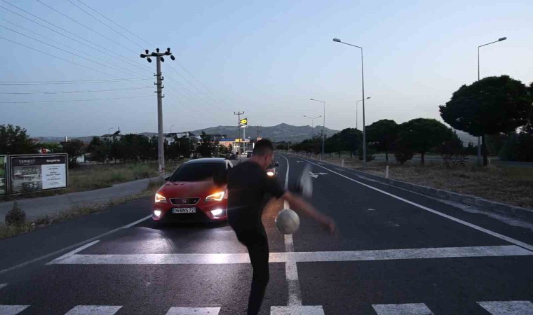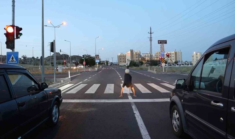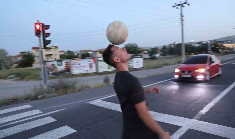 Kapadokya’ya gelen Kolombiyalı turist, kırmızı ışıkta bekleyen araçlara futbol topu ile gösteri yapıyor.