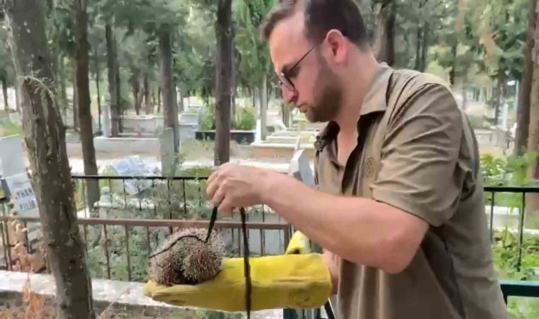 Manisa’nın Şehzadeler ilçesinde bulunan Kırtık Mezarlığında, mezarlık ziyareti yapan vatandaşlar boynuna ip geçirilmiş kirpiyi fark etti. Yakından baktıklarına kirpinin mezarlığa bağlandığı ve bulunduğu yerden kurtulmaya çalıştığı anlaşıldı. Durumun haber verilmesi üzerine bölgeye Doğa Koruma ve Milli Parklar Müdürlüğü yetkilileri sevk edildi. Ekipler büyük bir dikkatle kurtardıkları kirpiyi tedavisi yapılmak üzere veterinere götürdü. Açlık ve susuzluktan bitkin hale düşen kirpi tedavisi tamamlanmasının ardından doğaya salınacak.