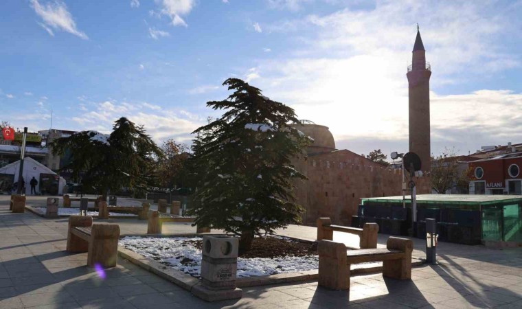Kırşehir’de etkili olan kar yağışı, tarihi mekanlarda kartpostallık görüntüler oluşturdu.