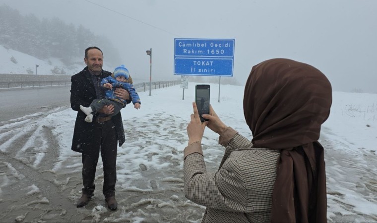 Tokat’ta kış boyu hasretle beklenen kar Mart ayında yağdı, beyaza bürünen Çamlıbel geçidi yolculara eğlence oldu.