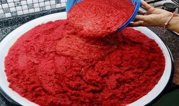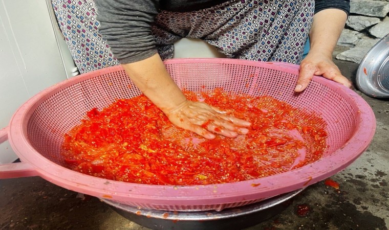 Doğan, kendi bostanlarından topladıkları domatesi ilk olarak doğrayıp tuzlayarak üç gün kadar hem suyunun süzülmesi hem de ekşimesi için çuvallarda beklettiklerini belirterek; “Daha sonra ise bu domatesleri elle süzgeçten geçirerek püre haline getirdik. yaklaşık 3 - 4 saat kaynatıyoruz. Yavaş yavaş dibini tutturmadan kaynatıyoruz. Kışlığımızı şimdiden hazırlamaya başladık.” Dedi.