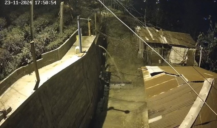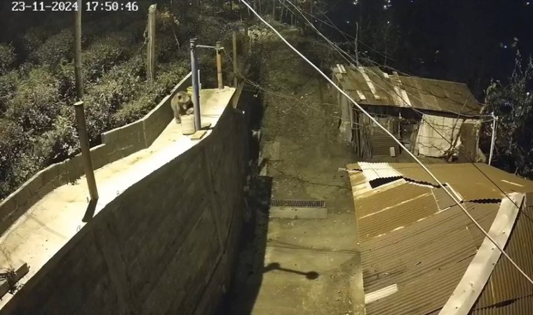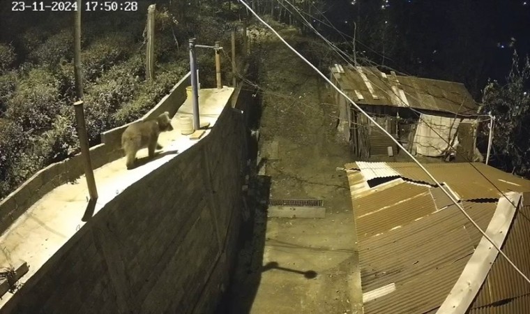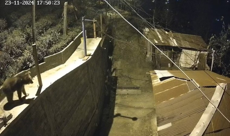 Merkeze bağlı Dörtyol köyünde kış uykusuna yatmayan ayı, 23 Kasım Cumartesi günü saat 17.58’de evlerin arka kısmında bulunan istinat duvarının üzerindeki yolda yürürken güvenlik kamerasına yakalandı. Görüntülerde evlerin olduğu bölgeye doğru duvarın üzerinde yürüyen ayının ilk önce duvarın sağ alt kısmında bulunan evleri kontrol ettiği görüldü. Sonrasında duvarın üzerindeki su dolu bidonu fark eden ayı, onunla oynamaya başladı. Bidonu devirince suyun hızlı bir şekilde aktığını gören ayı, korkarak duvarın sağ kısmında bulan çay tarım arazisine girerek hızlıca kaçtı. O anlar ise güvenlik kamerasına anbean yansıdı.