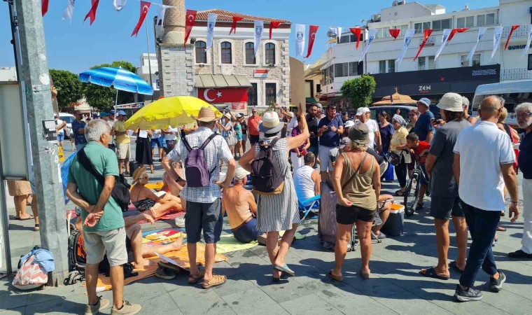 Kıyı işgallerine karşı her hafta ilçenin farklı bir noktasında eylem yapan Bodrum Özgür Kıyılar İnisiyatifi, bu kez seslerini yetkililere daha iyi duyurabilmek için Bodrum Belediye Meydanı’nda bir araya geldi. Şemsiyelerini meydana açıp havlularını yere seren eylemciler, “Denize Erişim Herkesin Hakkı”, “Kıyılar Kimsenin Malı Değildir”, “Elini Çek, Kıyı Herkesin Hakkıdır” yazılı dövizler açıp sloganlar attılar. Kimileri de şişme havuzu ve leğenle eyleme katıldı. Eylemciler, Belediye Başkanı Tamer Mandalinci’ye de çağrıda bulunarak “Başkan Buraya” sloganları attı. Eylemciler, meydandan geçen yerli ve yabancı turistlerin de dikkatini çekti. Eylemi dikkatle takip eden yabancı turistler, ne olup bittiğini anlamaya çalıştı.