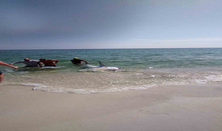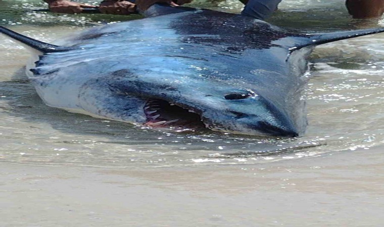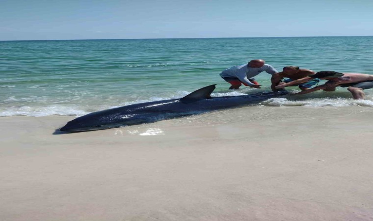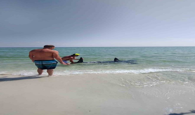ABD’nin Florida eyaletinde kıyıya vuran köpek balığını kuyruğundan çekerek kurtarmayı başardılar.