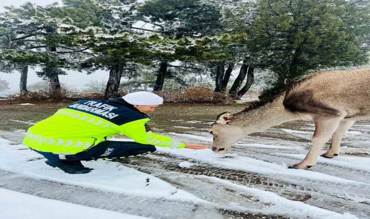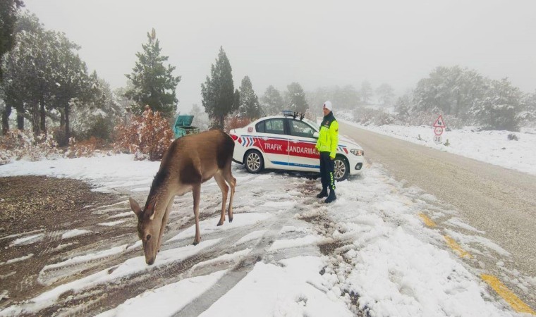 Eşeler Yaylası’na salınan kızıl geyiklerden biri, Yeşilova ilçesindeki Salda Kayak Merkezi yakınlarında karla mücadele çalışması yürüten jandarma trafik ekiplerinin yanına kadar yaklaştı. O anlar renkli görüntülere sahne olurken, ekipler bu beklenmedik ziyaret karşısında hayvanın sakinliğine hayran kaldı.