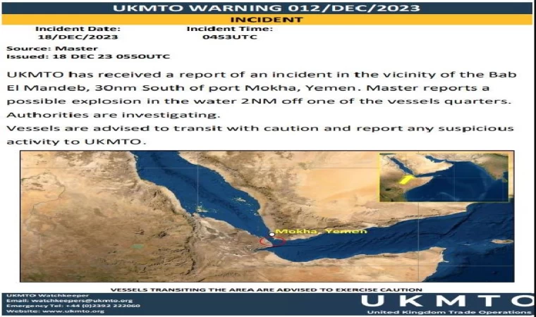 UKMTO’dan yapılan açıklamada, “UKMTO, Yemen'in Muha limanının güneyinde, Babülmendep civarında bir olay olduğuna dair rapor almıştır. Kaptan, gemilerden birinin 2 mil açığında suda olası bir patlama olduğunu bildirmiştir. Yetkililer olayı araştırıyor. Gemilerin dikkatli bir şekilde transit geçiş yapmaları ve herhangi bir şüpheli faaliyeti UKMTO'ya bildirmeleri tavsiye edilir” denildi.