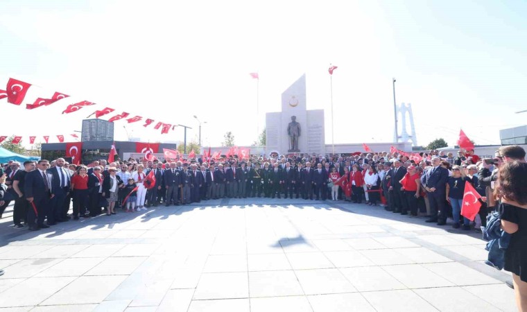 Kent meydanına gelen protokol, saygı duruşunda bulunulması ve İstiklal Marşı’nın okunmasının ardından yeni yapılan Atatürk Anıtı’na çelenk bıraktı. Öğrenciler de ellerindeki bayraklarla törene eşlik etti.