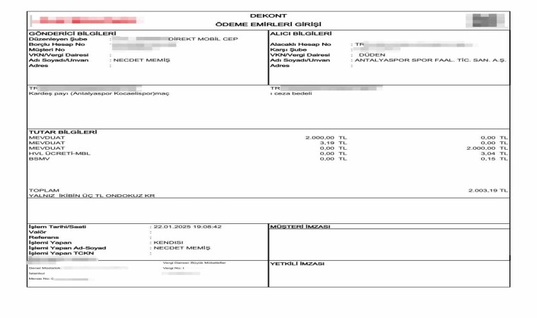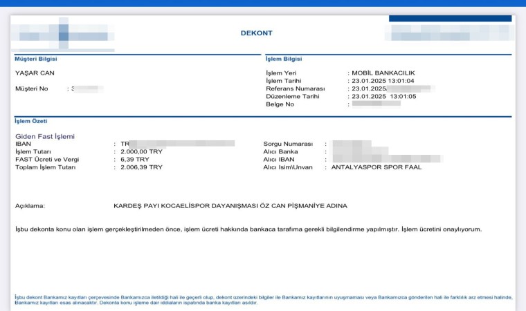 Antalyaspor’un 168 bin TL ile cezalandırılması Kocaelispor taraftarını harekete geçirdi. Yeşil-siyahlılar cezanın da kardeş payı yapılmasını istedi. Antalyaspor yöneticilerinin gerek olmadığını belirtmesine rağmen Kocaelispor taraftarının ısrarı, Kocaelispor Organizasyon Müdürü Mehmet Açık’ın araya girmesinin ardından kabul gördü. Kocaelispor’un 41 taraftarı kendi aralarında 84 bin TL’yi Antalyaspor’un hesap numarasına yatırmaya başladı. Dekontların açıklama kısmına da ‘kardeşlik’ vurgusu ekleyen Kocaelisporlular, “Her durumda yan yanayız. Bunu ceza da verseler bozamazlar. Anca beraber kanca beraber” dedi.