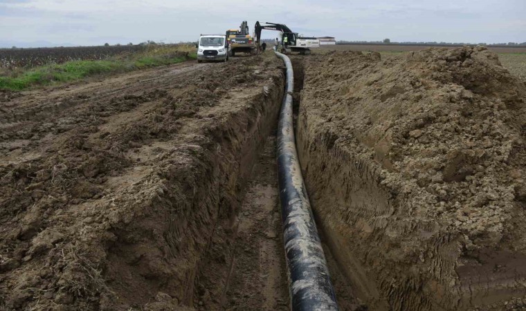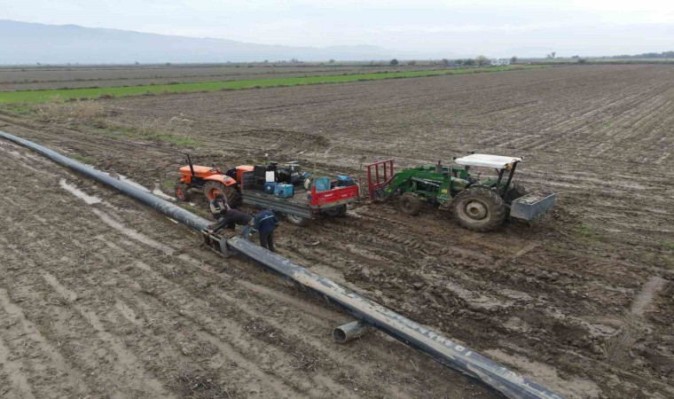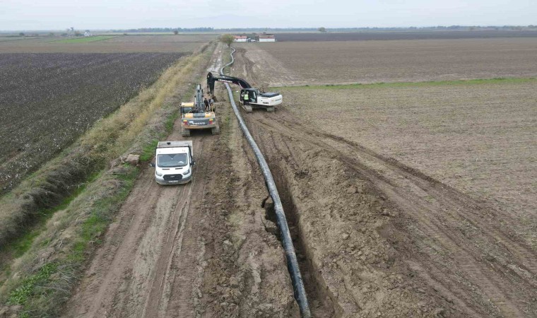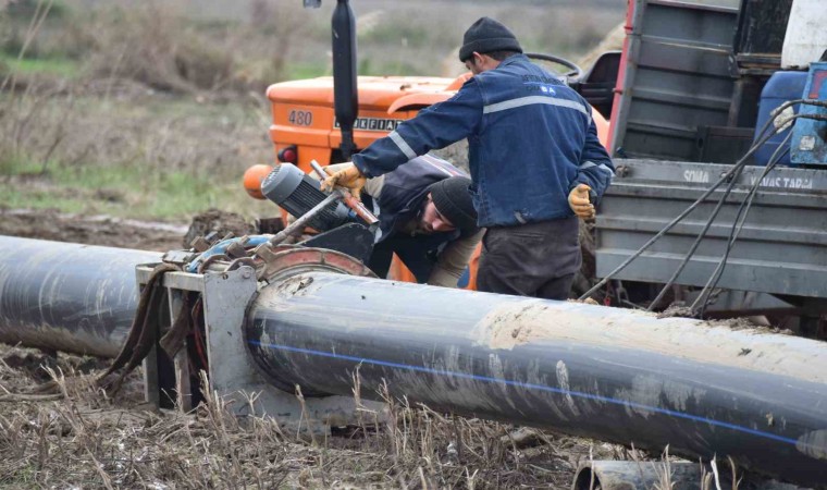 Aydın’ın Koçarlı ilçesinde 146 bin 40 dekar tarım arazisinin sulamasına hizmet verecek olan çalışmalarda bölgeye getirilen boruların montajı aralıksız devam ediyor.