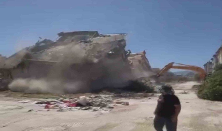 Depremin vurduğu Hatay’da kolonlarına zarar verilerek yıkılan 2 ağır hasarlı binanın yerle bir olma anları cep telefonu kamerasına yansıdı.