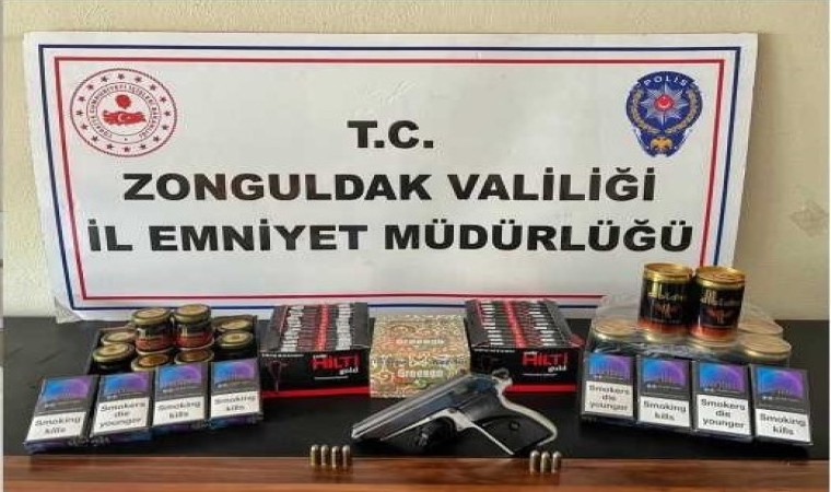 Öte yandan Kdz. Ereğli KOM Büro Amirliği ekiplerince yapılan çalışmalarda Ereğli ilçesinde faaliyette bulunan C.Z.’nin (45) tekel bayisinde yapılan aramada; 1 adet ruhsatsız tabanca, 7 adet kısa 9 mm fişek, 96 adet cinsel içerikli kapsül, 100 adet gümrük kaçağı sigara sarma kâğıdı, 8 adet gümrük kaçağı sigara, 8 adet cinsel içerikli içecek, 12 adet cinsel içerikli macun ele geçirildi.