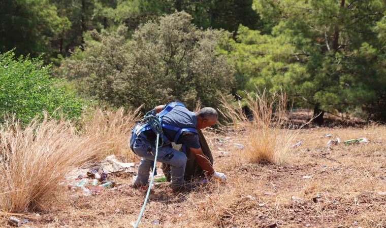 Marmaris Belediyesi ekipleri Armutalan seyir tepesinde aşağı halatlarla inerek çöp topladı. Sıcak havaya ve zorlu şartlara rağmen özveri ile çevreyi temizleyen Belediye ekibi yaklaşık 35 torba atık çıkardı.
