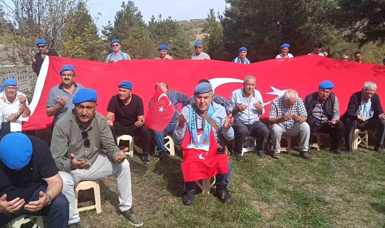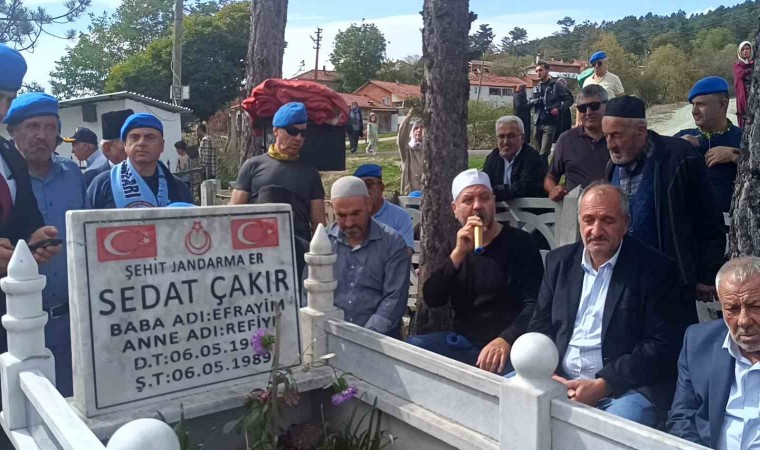 Namaz sonrası, köy mezarlığına doğru “Şehitler ölmez, vatan bölünmez” sloganları atarak ve tekbirler getirerek yürüyen grup, açtıkları dev Türk bayrakları ile duygusal anlar yaşattı. Şehit Sedat Çakır’ın kabrinde Kuran-ı Kerim tilaveti okunarak dualar edildi. Şehidin annesi Refiye Çakır evinde ziyaret edilip elini öperek dua edip, Komando marşı söylediler.