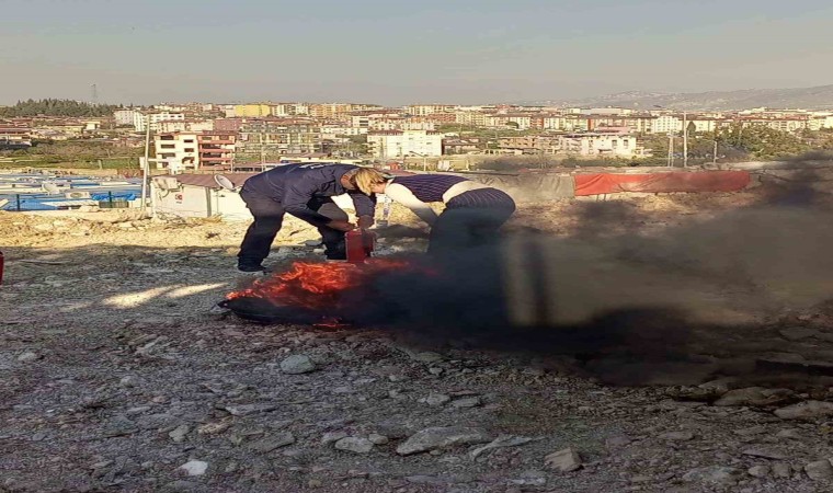 Hatay’ın Antakya ilçesinde konteyner kentte yaşayan vatandaşlara ve görevli personellere yangına karşı eğitim verildi.
