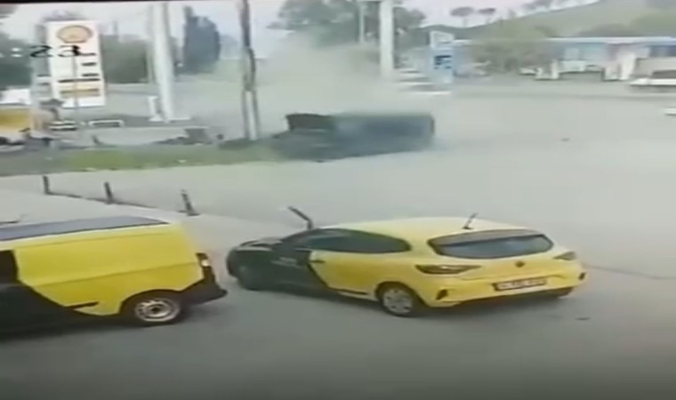 Bursa’da kontrolden çıkan ticari araç, anayolda kayarak önce tali yoldan çıkan araca, sonra yakıt istasyonuna daldı. O anlar ise kameraya anbean yansıdı.