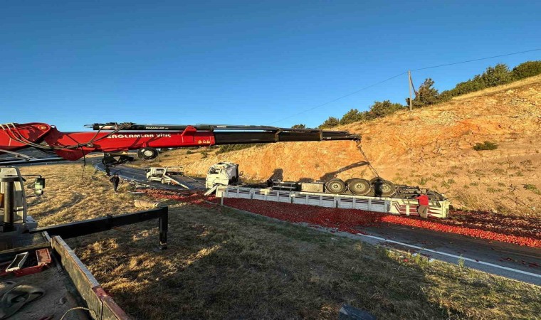 Kaza sonrası karayolunda trafik bir süreliğine tek şeritten sağlanırken, tır sürücüsünün Konya’dan aldığı domatesleri salça yapılmak üzere Eskişehir’e götürdüğü belirtildi.