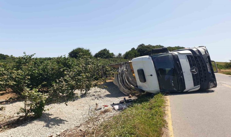 Sakarya’nın Kaynarca ilçesinde sürücüsünün kontrolünden çıkan kamyon devrildi. Meydana gelen kazada 1 kişi yaralandı.