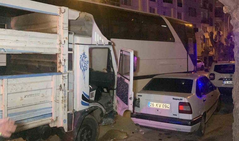 Kaza, Nefise Sultan Mahallesi Dr. Sadık Ahmet Caddesi girişinde meydana geldi. Edinilen bilgiye göre, İ.A. idaresindeki 70 ABS 053 plakalı kamyonet kontrolden çıkarak T.A. idaresindeki 58 EU 304 plakalı servis otobüsüne çarptı. Çarpışmanın etkisiyle savrulan kamyonet daha sonra yol kenarında park halindeki iki otomobile çarparak durabildi. Kazada kamyonetin sürücüsü ile park halindeki 26 KV 094 plakalı otomobilde bulunan 11 yaşındaki M.A., yaralandı. İhbar üzerine olay yerine sağlık, itfaiye ve polis ekipleri sevk edildi. Yaralılar kaza yerine gelen ambulansla kaldırıldıkları Karaman Eğitim ve Araştırma Hastanesi’nde tedavi altına alınırken, sağlık durumlarının iyi olduğu öğrenildi. Servis otobüsünün sürücüsü T.A., “Kamyonet ana yoldan geldi ve durmadan önce otobüse sonra da park halindeki iki araca çarptı” dedi.