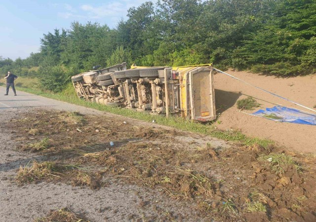 Kontrolden çıkan kum yüklü kamyon yan yattı: 1 hafif yaralı
