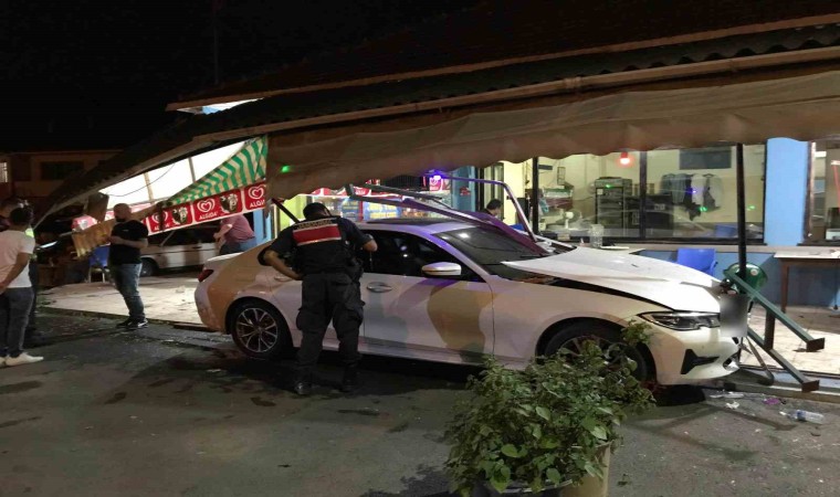 Sakarya’nın Akyazı ilçesinde sürücüsünün kontrolünden çıkan lüks otomobil, park halinde otomobile çarptıktan sonra kahvehaneye girdi. Meydana gelen olayda araç sürücüsü ve bir engelli birey yaralanırken kaza anı güvenlik kamerasına yansıdı.
