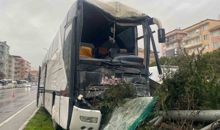 Uşak’ta kontrolden çıkan servis otobüsü önce kamyon ve otomobile, sonrasında ise aydınlatma direği ile ağaca çarparak durabildi.