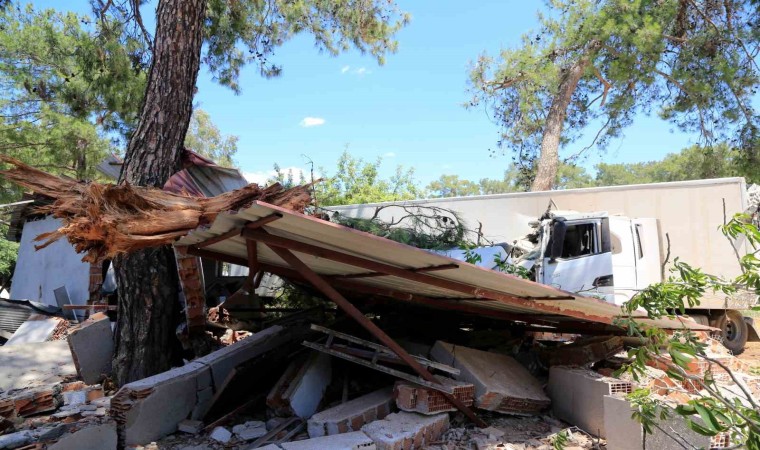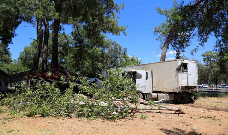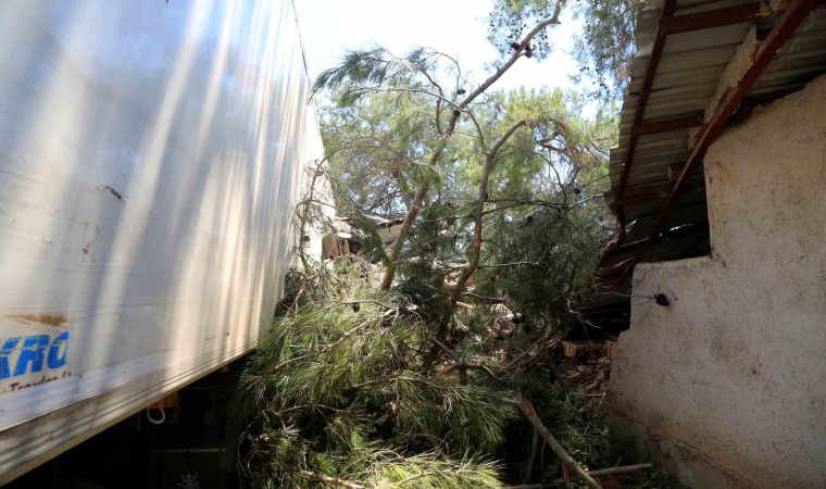 Antalya’da yoldan çıkan tır önce çam ağacına, ardından da lojmanın depo olarak kullanılan bölümüne çarparak konutlara birkaç metre mesafede durabildi.