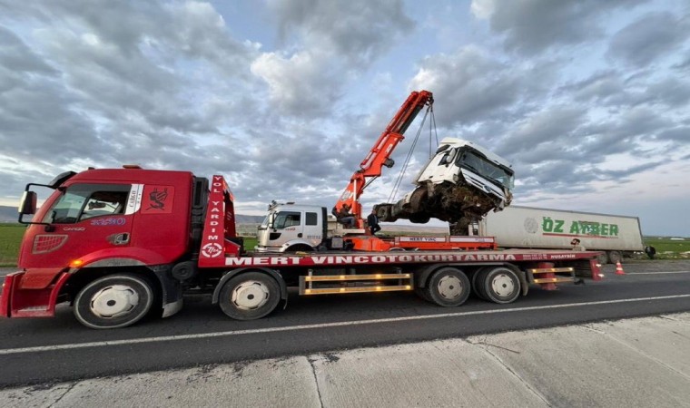 Mardin’in Nusaybin ilçesinde kontrolden çıkan tırın devrilmesi sonucu meydana gelen kazada sürücü yaralandı.