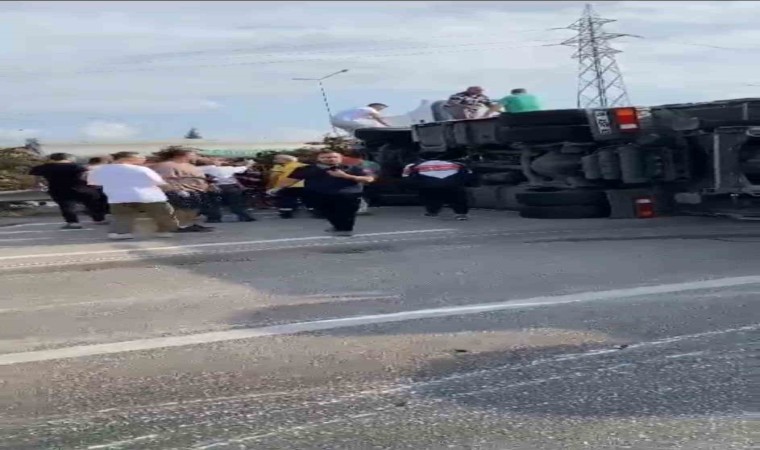 Kaza merkez Osmangazi ilçesi Bursa Çevre Yolu üzerinde meydana geldi. Sürücüsünün idaresindeki yük dolu tır bir anda kontrolden çıktı. Bir süre savrulan tır anayolda yan yatıp tüm şeritlerin tamamen kapanmasına neden oldu. Çevredekilerin yardımıyla çıkarılan sürücünün şans eseri burnu bile kanamazken, trafiğin uzun süre aksamasına neden olan kazayla ilgili tahkikat başlatıldı.