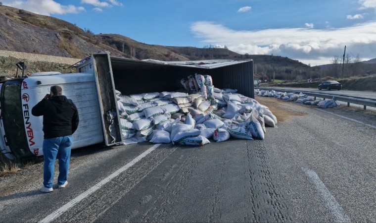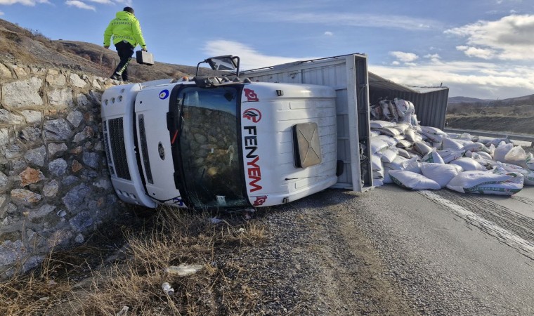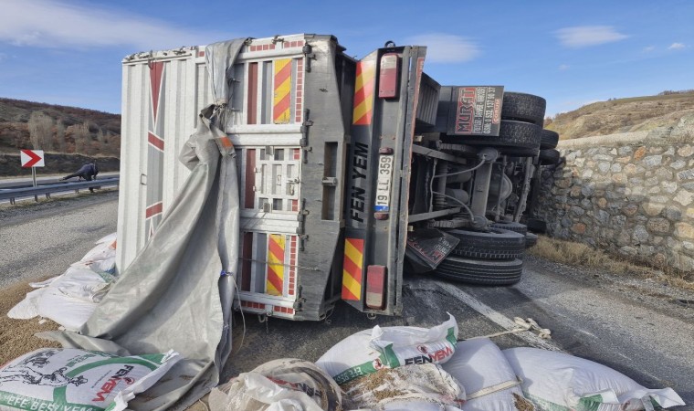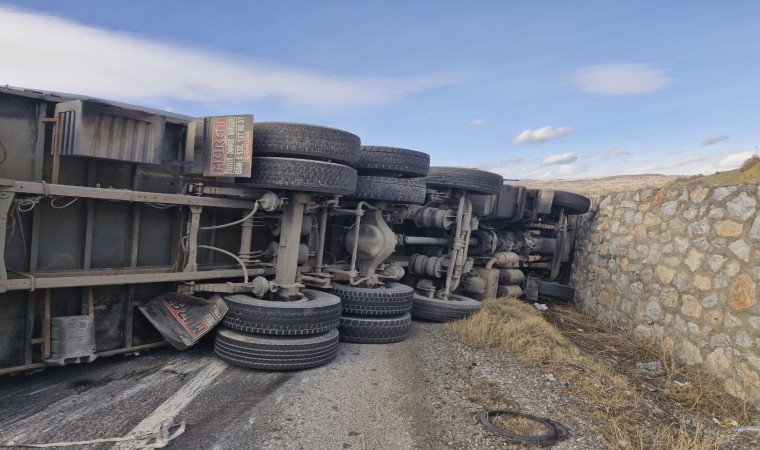 Çorum’da sürücüsünün kontrolünden çıkan tır devrildi. Kazada araç sürücüsü yaralandı.
