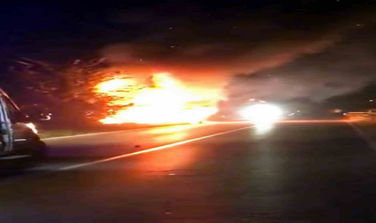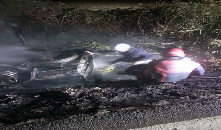 Sakarya’nın Erenler ilçesinde sürücüsünün kontrolünden çıkan otomobil, yol kenarına uçarak alev aldı. Kazanın ardından otomobildeki 2 yaralı çevredekilerin yardımı ile araçtan çıkarılırken, yanan otomobilden geriye demir yığını kaldı.