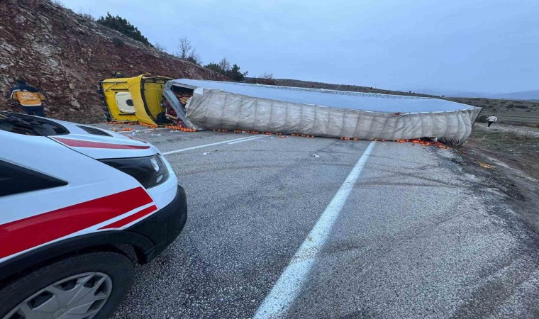 Konya’nın Beyşehir ilçesinde meyve yüklü tırın devrilmesi sonucu yol ulaşıma kapanırken yaralı sürücü hastaneye kaldırıldı.